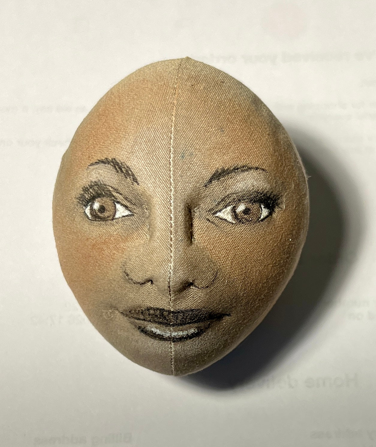This head is a 4 part sculpted head with brown eyes made with Kona cotton shade Wheat. All of the features drawn on it with Pigma fine liner pen and Prismacolour pencils, and sprayed with a fixative. They are made using a Jan Horrox pattern and will fit any of Jan Horrox dolls made from any of her standard patterns. These are all for an 18" doll. Previously sold only at retail shows they are now available online. Each one is different and so each head is displayed here with a separate photo and number. They are not washable and not suitable for small children. They do not fit the 14" doll patterns.